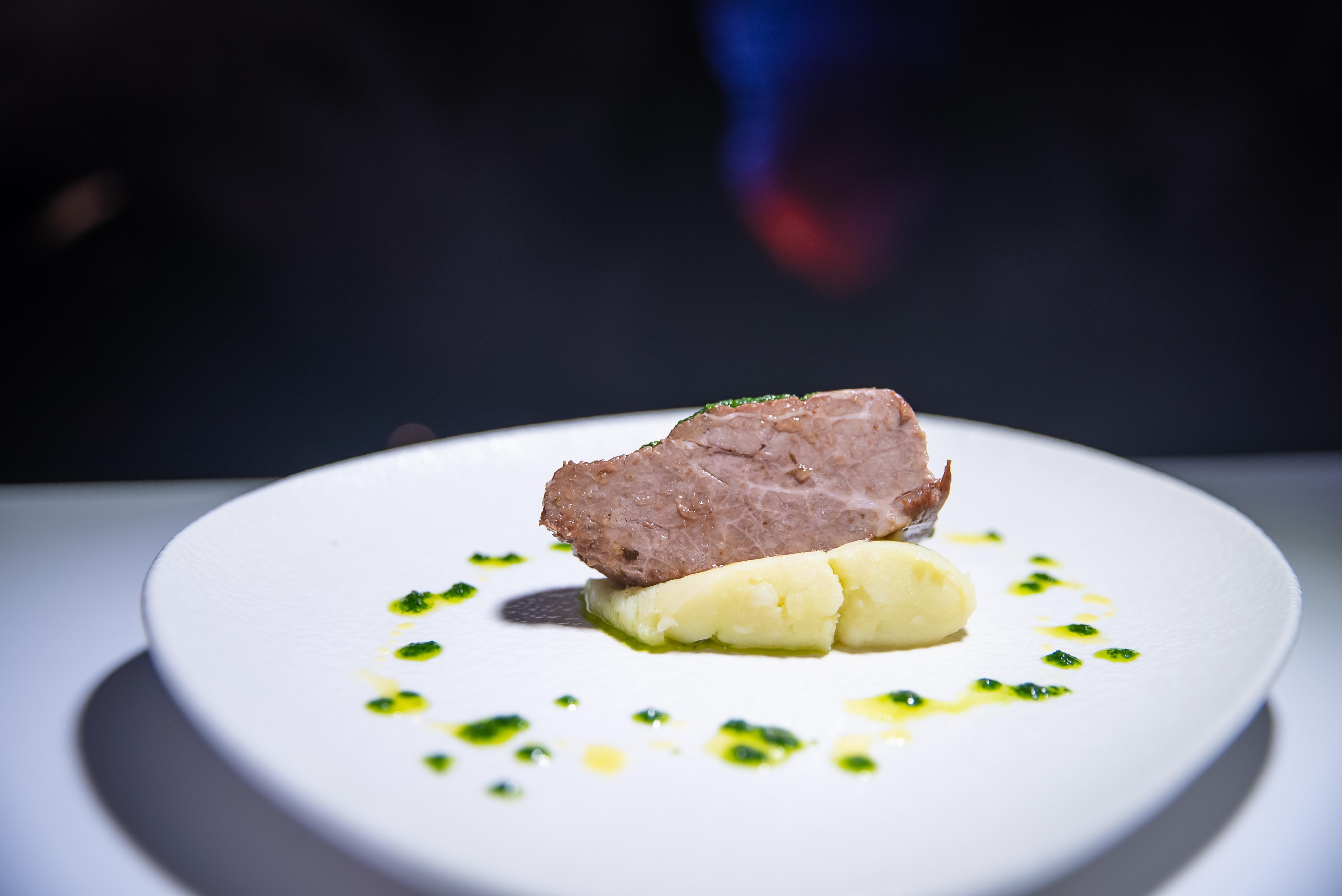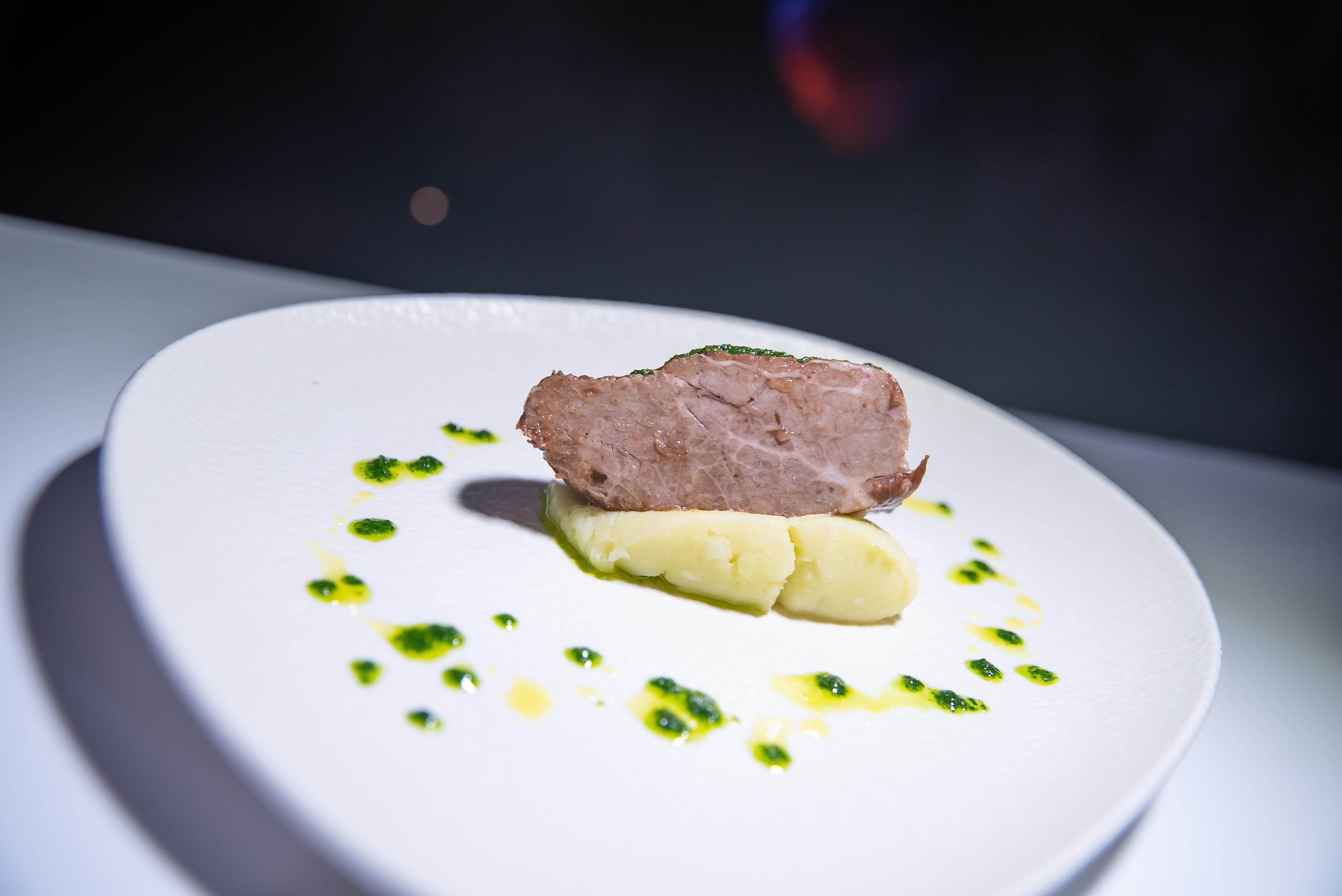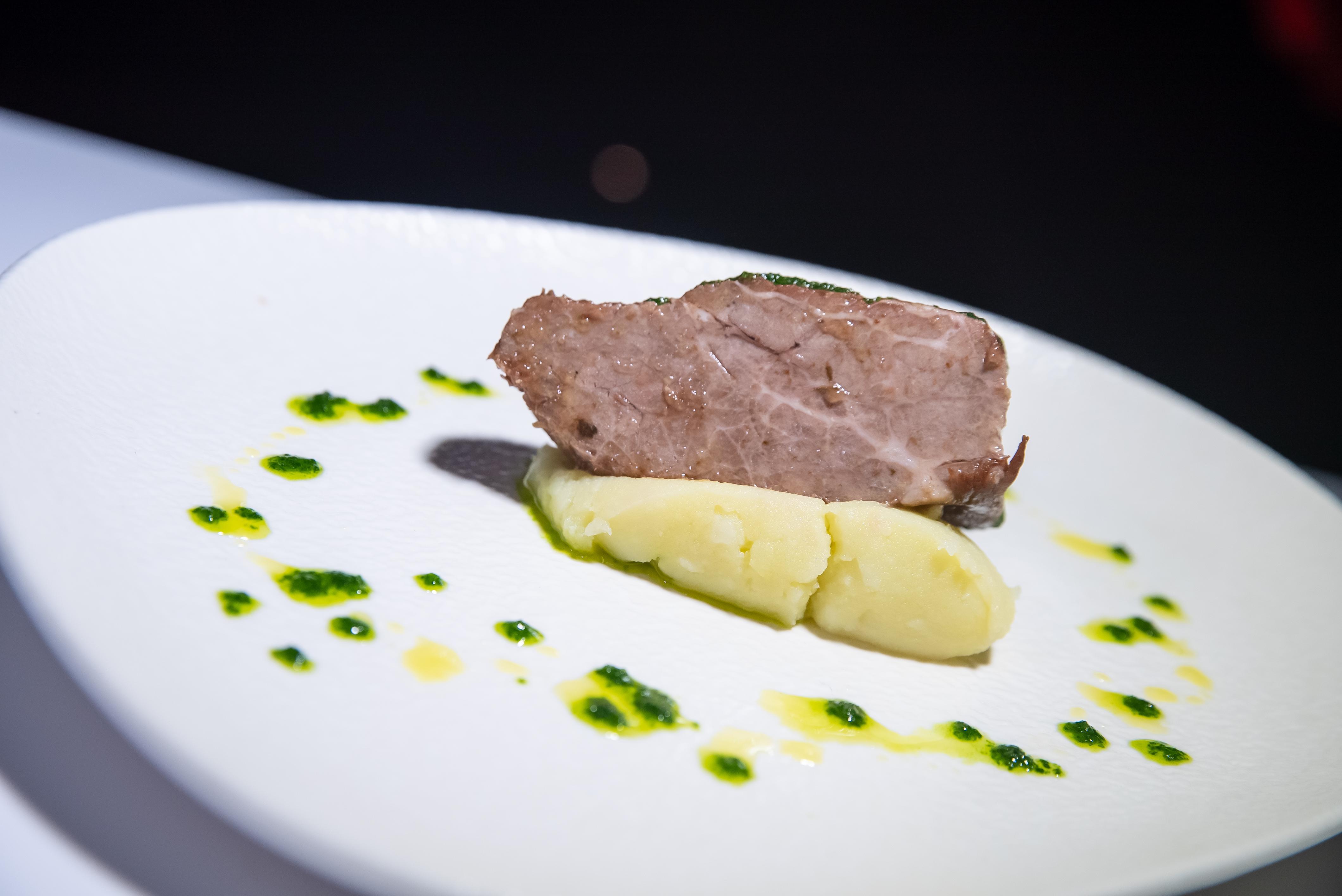 Para el montaje del plato se añade un poco de puré en el centro del plato. Una porción de carne sin caldo en el centro y el aceite aromático por encima. Si fuese necesario se le añade sal en escamas.